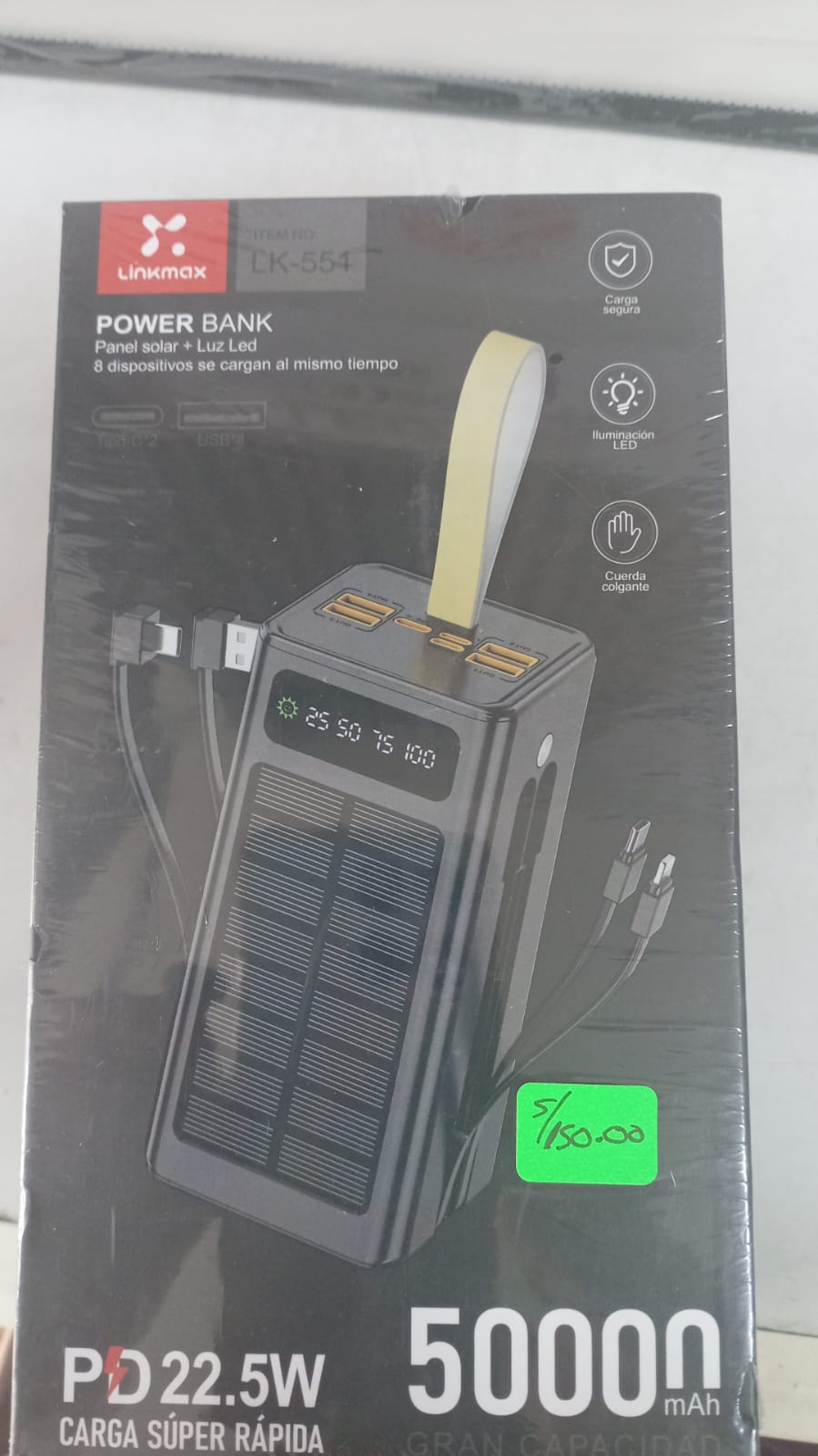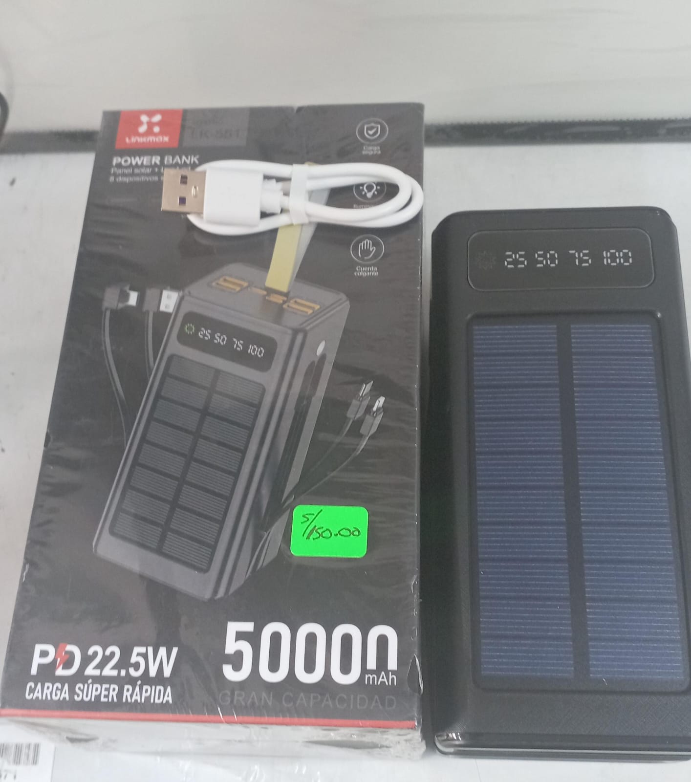 Cuenta con panel solar integrado, ideal para recargar en exteriores, y una pantalla digital inteligente que muestra el nivel exacto de batería. Su gran capacidad permite cargar múltiples veces celulares, tablets, audífonos, parlantes y otros dispositivos electrónicos.
